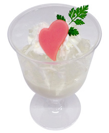ミルクプリンにココナッツシロップゼリー、ホイップクリーム、ココナッツ、そしてピンクのハートチョコをトッピング。